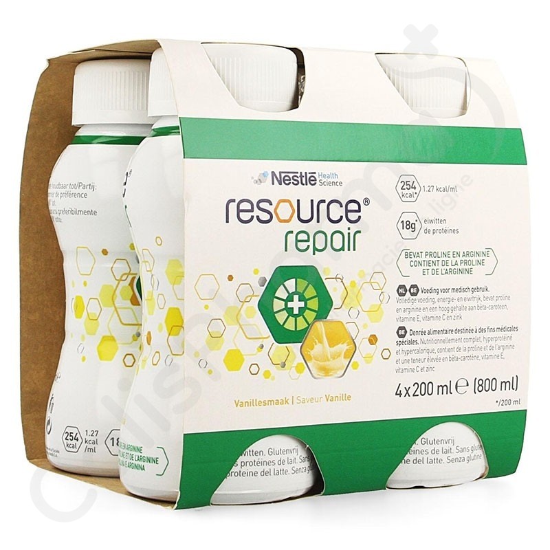 Resource Repair Vanille est un aliment diététique à usage médical qui est hypercalorique, enrichi en protéines et enrichi en proline et arginine.