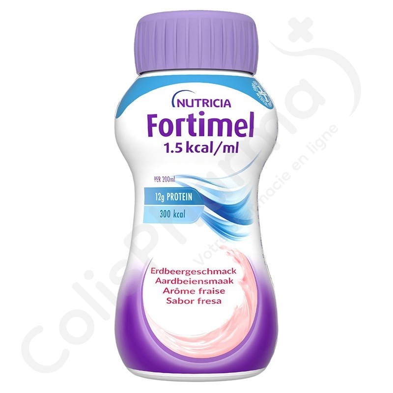 Fortimel 1.5 kcal Fraise est un complément nutritionnel oral hyperprotidique, hyperénergétique, complet. Il apporte protéines, énergie, lipides et tous les sels minéraux, les vitamines et les oligo-éléments nécessaires.