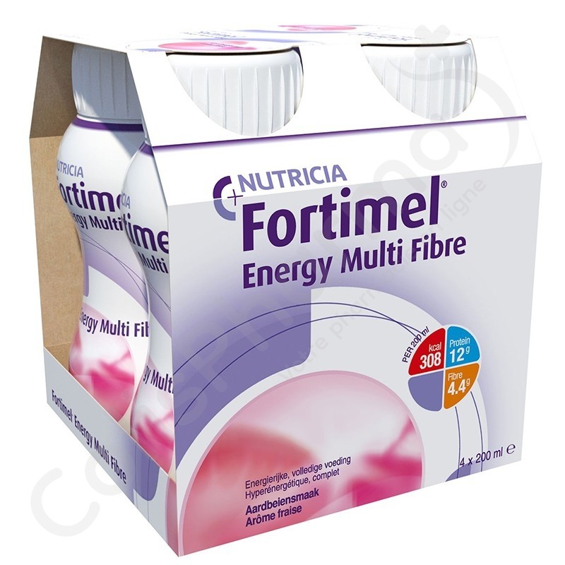 Fortimel Energy Multi Fibre Fraise est un aliment diététique prêt à l'emploi qui est destiné à des fins médicales spéciales pour les besoins nutritionnels en cas de dénutrition associée à une maladie et/ ou à des troubles de la déglutition.