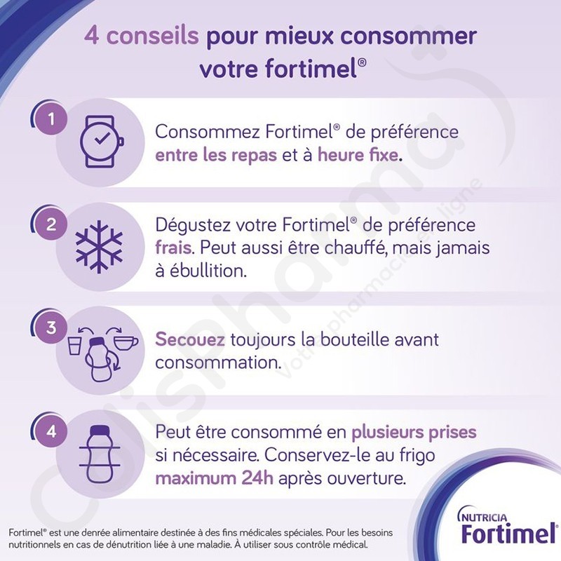 Si vous ne recevez pas d'instructions d'utilisation spécifiques: complétez pendant 3 mois votre alimentation avec 1-3 bouteille(s) de Fortimel Energy par jour.