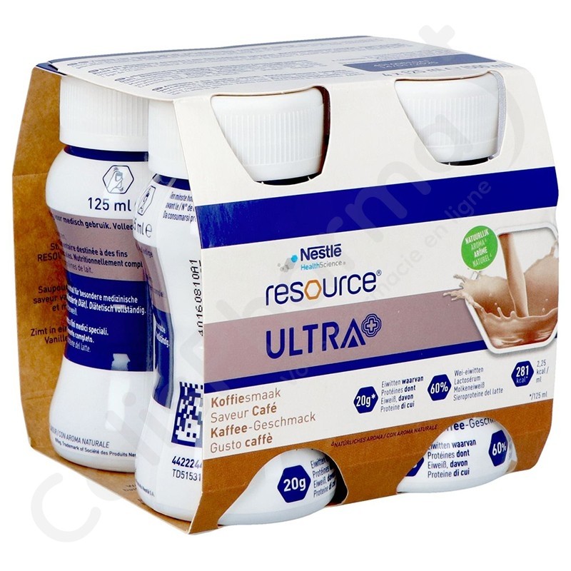 Resource Ultra+ est un aliment riche en protéines et en énergie. Une bouteille de 125 ml contient 20 g de protéines de lactosérum (28 % de kcal) et 281 kcal (2,25 kcal/ml). Nutrition à usage médical en cas de malnutrition ou de risque de malnutrition chez l'adulte.