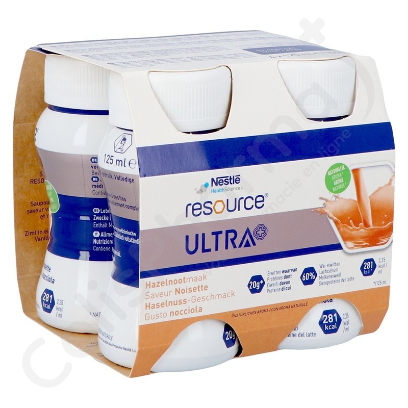 Resource Ultra+ est un aliment riche en protéines et en énergie. Une bouteille de 125 ml contient 20 g de protéines de lactosérum (28 % de kcal) et 281 kcal (2,25 kcal/ml). Nutrition à usage médical en cas de malnutrition ou de risque de malnutrition chez l'adulte.