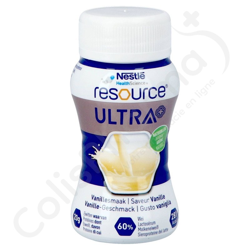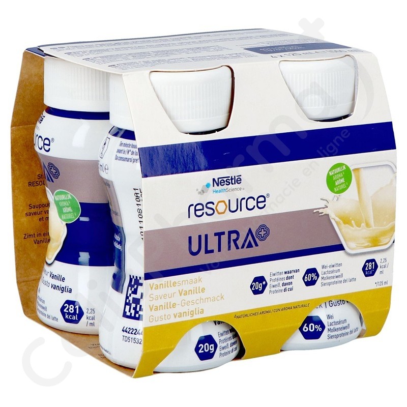 Resource Ultra+ est un aliment riche en protéines et en énergie. Une bouteille de 125 ml contient 20 g de protéines de lactosérum (28 % de kcal) et 281 kcal (2,25 kcal/ml). Nutrition à usage médical en cas de malnutrition ou de risque de malnutrition chez l'adulte.