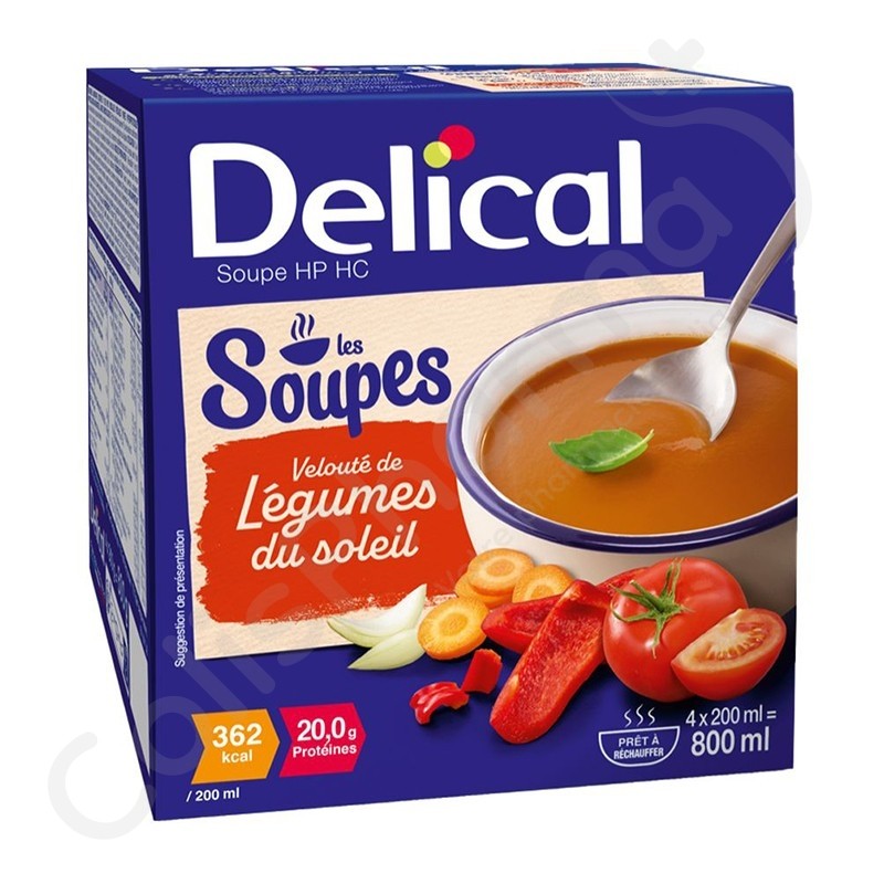 Delical Soupe Légumes du Soleil est une soupe nutritive hyperprotéinée, hypercalorique (HP HC), aromatisée, à base de légumes.