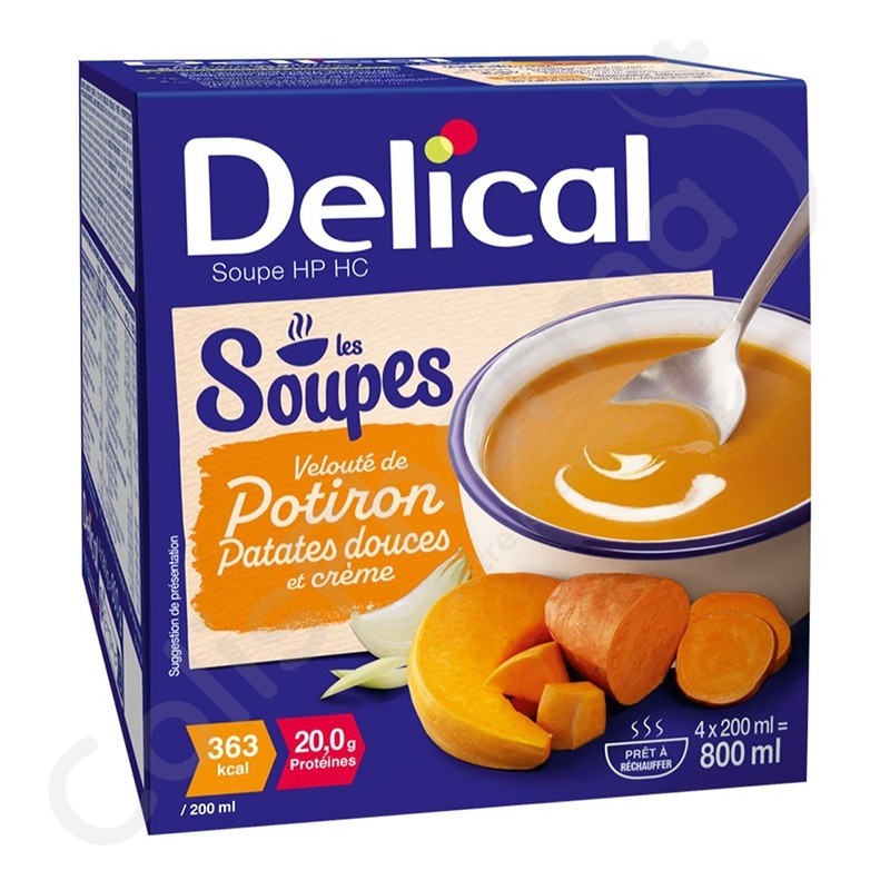Delical Soupe Potiron Patates Douces & Crème est une soupe nutritive hyperprotéinée, hypercalorique (HP HC), aromatisée, à base de légumes.