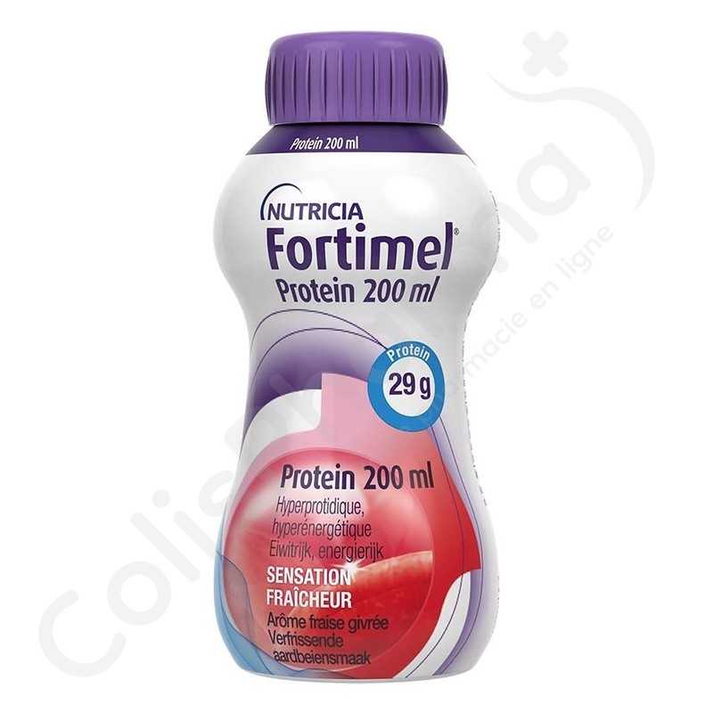 Fortimel Protein est un complément nutritionnel hyperprotidique (protéiné), hyperénergétique, prêt à l'emploi. Cette boisson contient des vitamines, minéraux et oligo-éléments. Fortimel Protein est utilisé pour les besoins nutritionnels en cas de dénutrition associée à une maladie. Spécialement développée pour les personnes présentant des besoins protéiques et énergétiques accrus comme par exemple les personnes physiquement affaiblies, les patients atteints de cancer et les personnes ayant subi une opération ou un trauma.