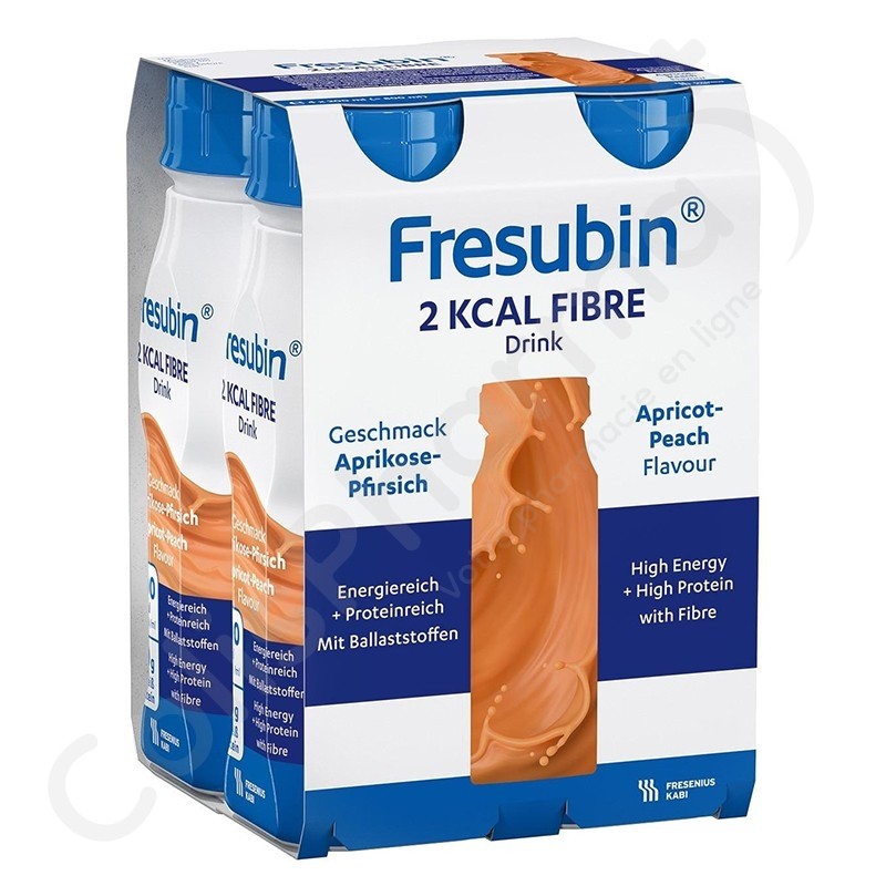 Fresubin 2kcal Fibre Drink Pêche-Abricot est un aliment enrichi d'énergie. On retrouve dans cet assortiment des boissons lactées, hyperprotéinées (20 g / 200 ml) et hypercaloriques (2 kcal / ml).