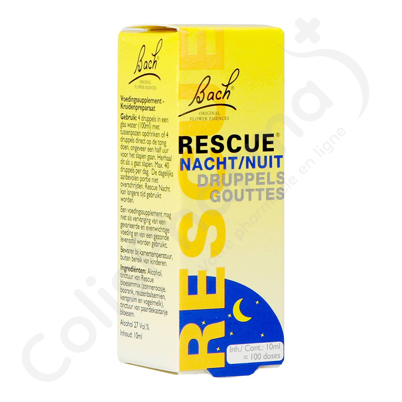 RESCUE® Nuit est une création de Bach à base d'ingrédients naturels, qui associe les cinq fleurs de Bach déjà reprises dans la composition originale du RESCUE® (cherry plum, clematis, impatiens, rock rose et star of Bethlehem), à la fleur White Chestnut (marronnier blanc).