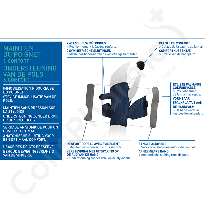 L’attelle poignet d’immobilisation s’ouvre largement pour faciliter le passage de la main. Elle comporte des renforts (dorsal et palmaire) afin de placer le poignet dans une position optimale. Les 2 attaches auto-agrippantes symétriques permettent de centrer le renfort conformable sous la paume et la sangle amovible garantit un serrage anatomique au niveau du poignet : une immobilisation rigoureuse est ainsi assurée.