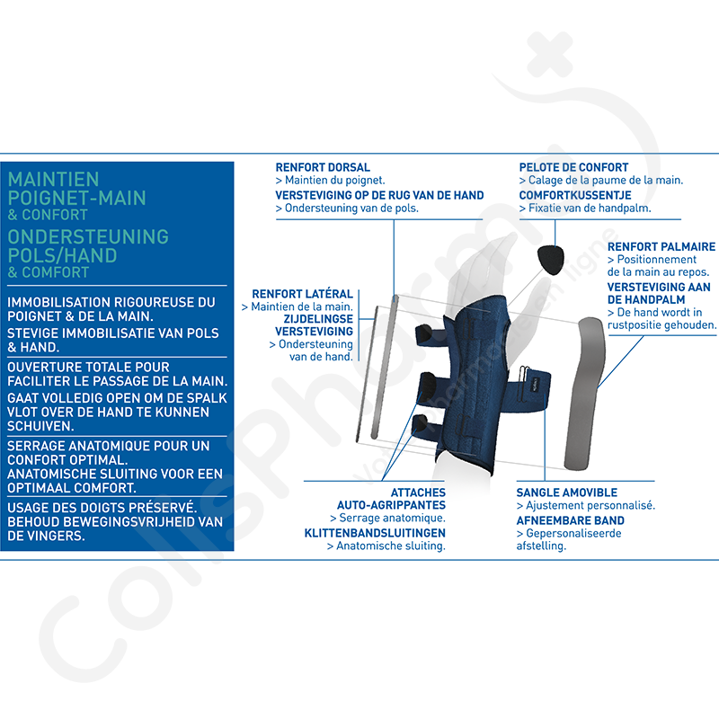L'attelle poignet-main d'immobilisation s'ouvre entièrement pour faciliter la mise en place et le retrait, notamment en cas d'oedème. Elle comporte des renforts (dorsal, palmaire et latéral) afin de placer à la main et le poignet une position optimale. Les 2 attaches auto-agrippantes et la sangle amovible permettent de garantir un serrage anatomique et d'assurer une immobilisation rigoureuse.