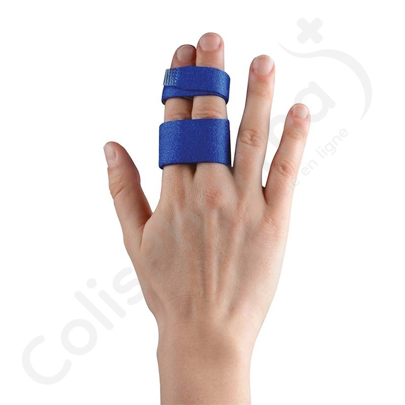 Immobiliser le doigt atteint avec le doigt adjacent le moins gênant pour les gestes du quotidien. Fixer les bandes sur les phalanges, éviter les articulations pour conserver leur mobilité. Il est possible de découper les bandes pour adapter leur hauteur. Vérifiez que la flexion et l’extension des doigts est conservée et que les bandes ne sont pas trop serrées pour la circulation sanguine. La mise en place est illustrée dans la notice d’utilisation.