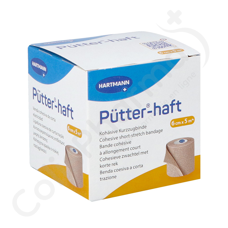 Le bandage adhère sur lui-même, mais pas sur la peau, les poils ou les vêtements. Le bandage ne glisse pas grâce à la structure de son matériau. Le matériau à texture lâche est perméable à l’air, ce qui réduit le risque de macération. Pütter-haft est facilement appliqué parce qu’il est souple et facilement drapé. Si le bandage est trop long, il peut être coupé sans que les bords ne s’effilochent. Pütter-haft peut rester en place lors d’un examen RX parce qu’il laisse passer les rayons. Normalement, le bandage peut être retiré la nuit et remis en place le lendemain matin. En cas de jambes minces, pour obtenir de meilleurs résultats, il est recommandé de les envelopper d’abord dans de l’ouate jusqu’à ce qu’elles aient une épaisseur normale.