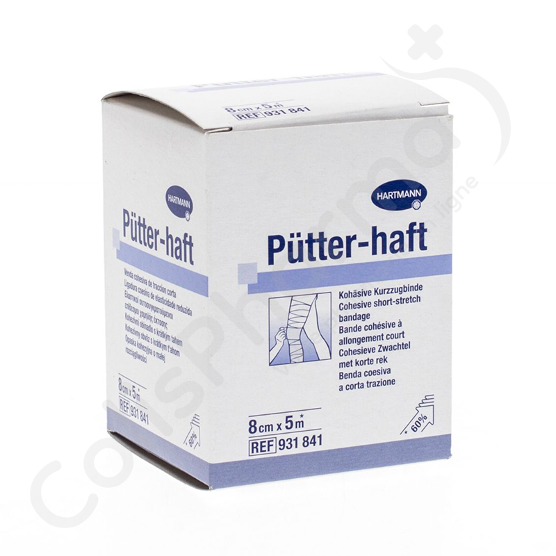 Le bandage adhère sur lui-même, mais pas sur la peau, les poils ou les vêtements. Le bandage ne glisse pas grâce à la structure de son matériau. Le matériau à texture lâche est perméable à l’air, ce qui réduit le risque de macération. Pütter-haft est facilement appliqué parce qu’il est souple et facilement drapé. Si le bandage est trop long, il peut être coupé sans que les bords ne s’effilochent. Pütter-haft peut rester en place lors d’un examen RX parce qu’il laisse passer les rayons. Normalement, le bandage peut être retiré la nuit et remis en place le lendemain matin. En cas de jambes minces, pour obtenir de meilleurs résultats, il est recommandé de les envelopper d’abord dans de l’ouate jusqu’à ce qu’elles aient une épaisseur normale.