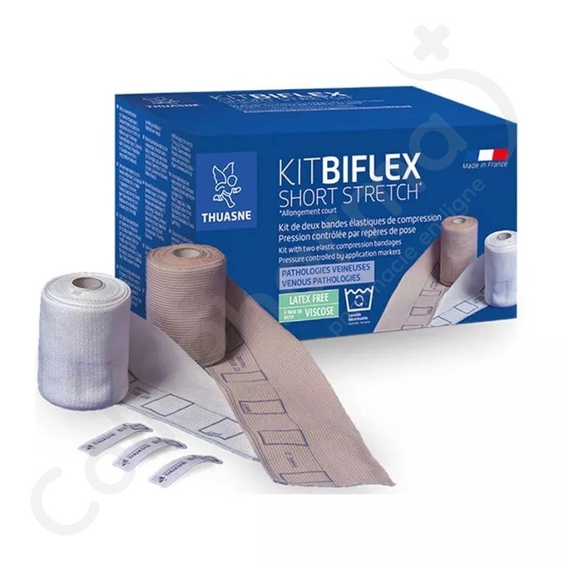 L’action combinée des 2 bandes de KITBIFLEX permet de garantir le niveau de pression nécessaire recommandé par la HAS(1) (> 36 mmHg). Ces bandes peuvent être laissées en place jour et nuit sur le membre, jusqu’à 7 jours maximum. En début de traitement d’un ulcère, le bandage devra être renouvelé et/ou repositionné à chaque changement de pansements locaux soit autant de fois que le niveau d’exsudat le nécessite, ou lorsque le volume du membre évolue (œdème). Le traitement est préconisé jusqu’à cicatrisation complète de l’ulcère veineux. Le maintien d’un dispositif de compression (bas ou bandes) est recommandé après la cicatrisation pour prévenir la récidive.