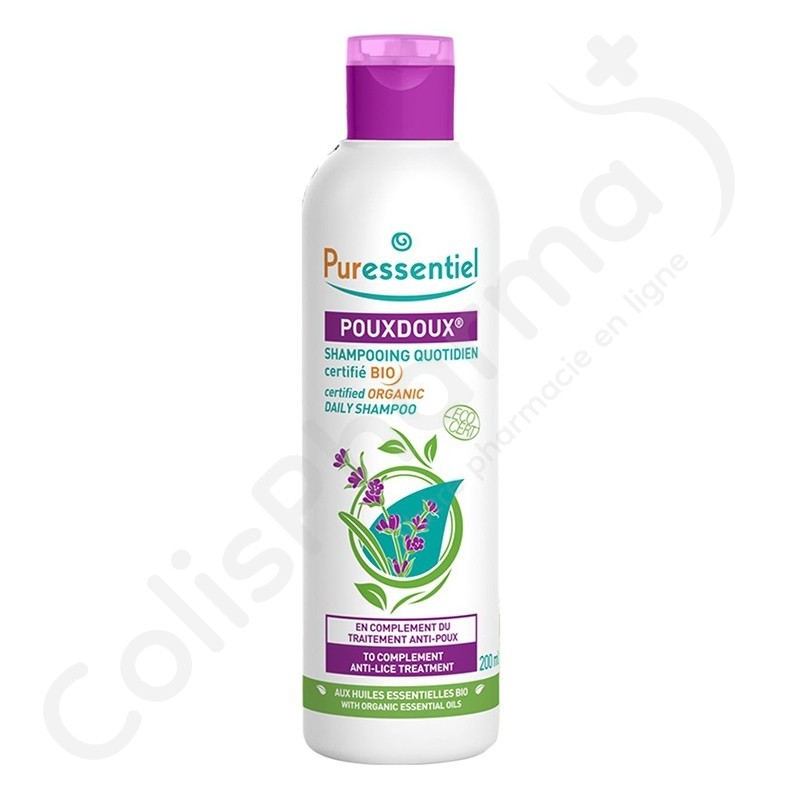 Puressentiel Anti-poux Poudoux Shampooing bio permet un démêlage aisé des cheveux ainsi qu'une élimination des lentes, larves et poux morts. Ce shampooing naturel s'utilise en complément de la lotion anti-poux.