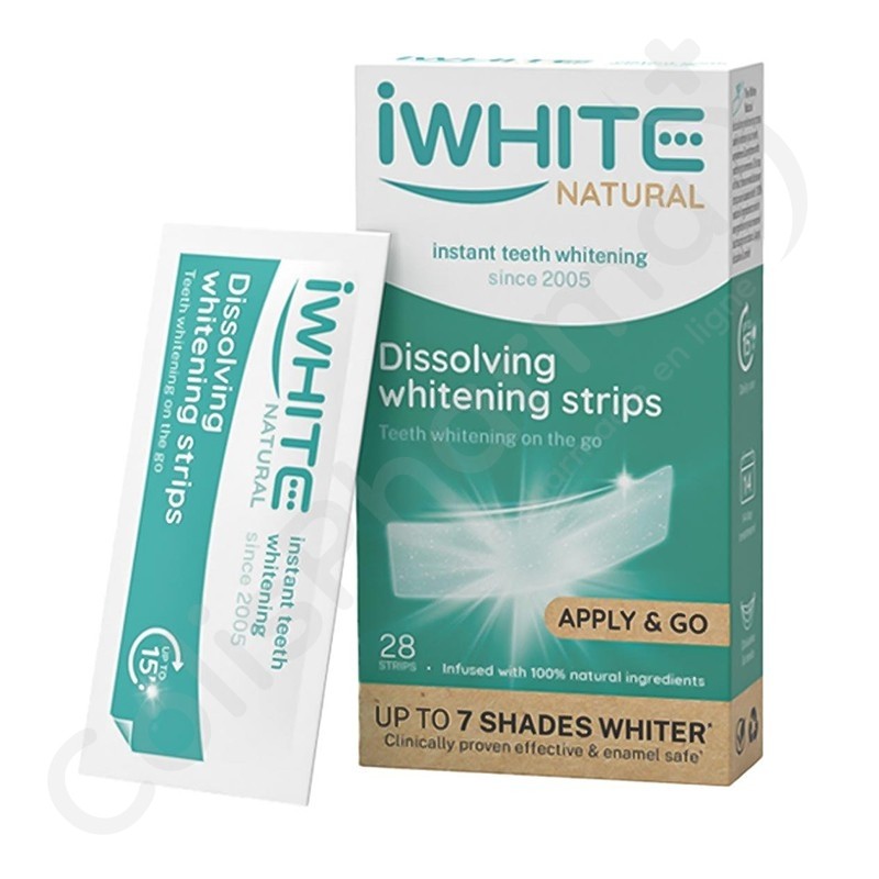 Les bandes blanchissantes iWhite Natural dissolvent vos dents en toute sécurité, n'importe où et n'importe quand, sans rien à enlever. De plus, ces bandes révolutionnaires sont composées d'ingrédients 100 % naturels qui sont doux pour l'émail mais tenaces pour les taches.