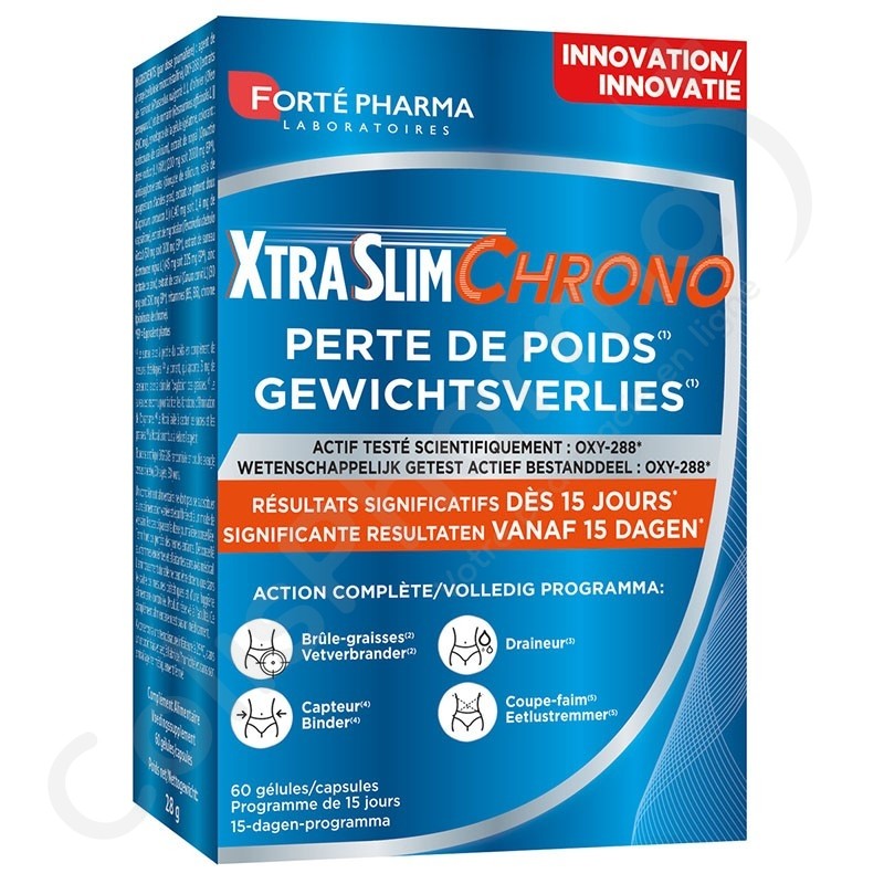Découvrez XtraSlim Chrono, sa formule est composée d'un actif scientifiquement testé qui permet d'obtenir des résultats significatifs dès 15 jours. Grâce à ces ingrédients, ce nouveau produit répond aux 5 principaux objectifs de la perte de poids : il aide à mincir, à brûler les graisses, à drainer, à capter les sucres et à réduire l'appétit.