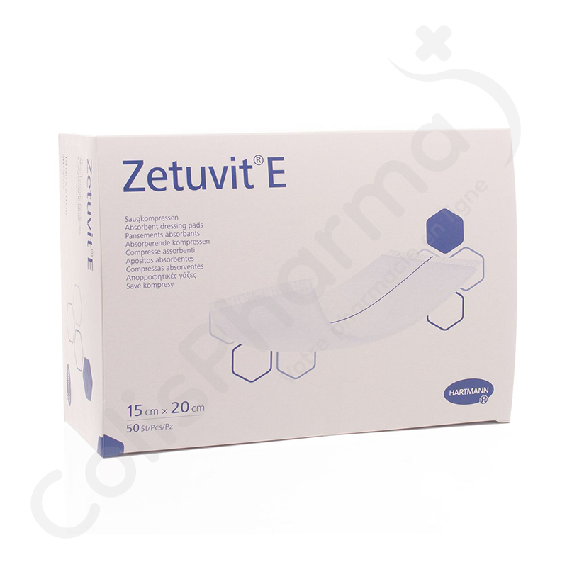 Zetuvit E est composé de quatre couches. Le noyau absorbant en ouate de cellulose est enveloppé d’une fine couche de cellulose non-tissée assurant la répartition homogène des liquides sur tout le pansement. Le dos de la compresse avec marquages bleus est en polypropylène non-tissé hydrophobe tout en n’étant pas occlusif et perméable à l’air. Ceci prévient la formation de caillots d’exsudat dans le pansement. La face avant est en non-tissé en polypropylène hydrophile qui empêche l’adhérence du pansement dans la plaie. Pourvu du marquage CE selon la directive UE 93/42/CE.