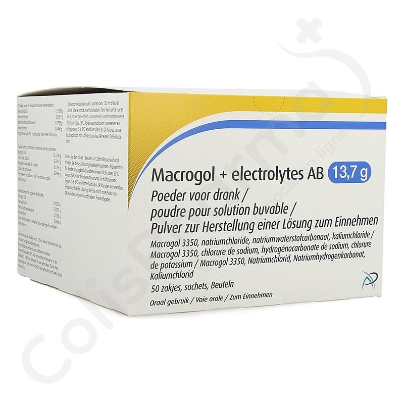 Macrogol + électrolytes AB est un laxatif destiné au traitement de la constipation chez les adultes, les adolescents et les personnes âgées. Macrogol + électrolytes AB vous aide à aller plus facilement au toilette même lorsque vous présentez une constipation de longue durée. Il fonctionne également en cas de constipation très sévère, appelée impaction fécale.