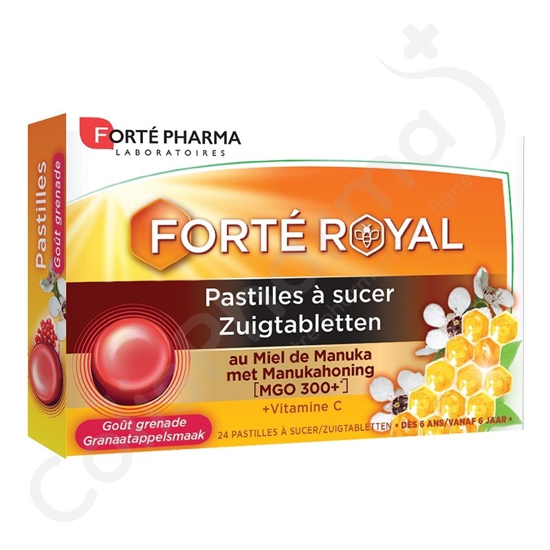 Les pastilles à sucer Forté Royal renforcent les défenses naturelles, luttent contre la fatigue, redonnent du tonus et renforcent l'organisme. Le miel de Manuka possède de puissants pouvoirs anti-bactériens.