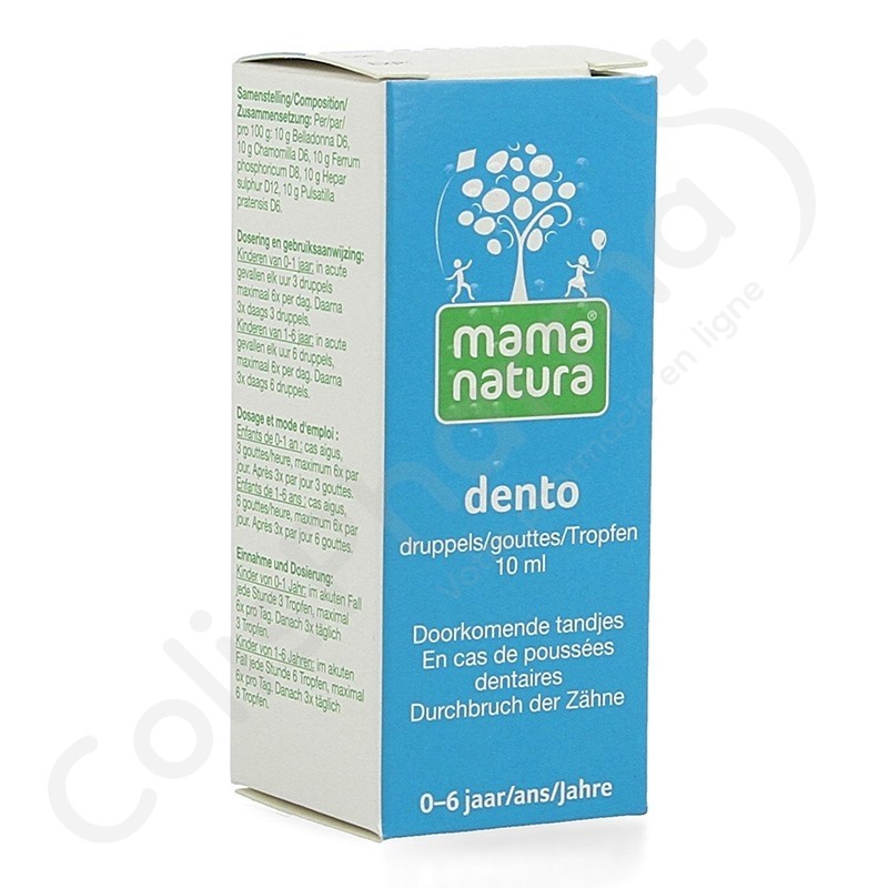 Mama Natura Dento Gouttes est un médicament homéopathique utilisé pour soulager les symptômes associés aux poussées dentaires, tels qu'une gencive douloureuse, des maux d'oreille, des états d'irritabilité ou d'agitation, une fièvre légère et des selles molles.
