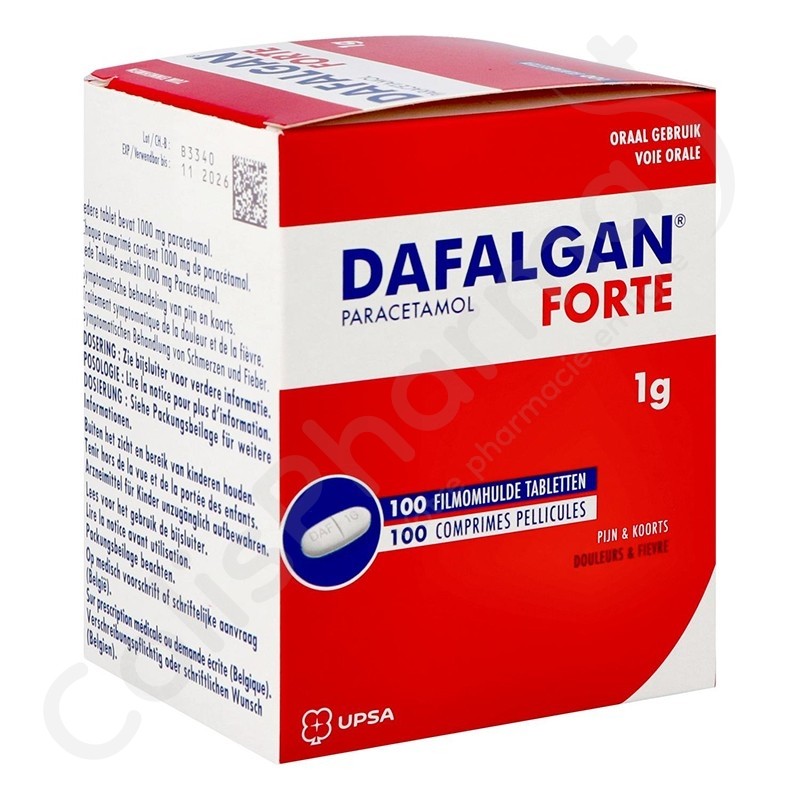 Le Dafalgan Forte 1g, vendu en Belgique, est un antidouleur et antipyrétique dont le principe actif est le paracétamol. Il équivaut donc au Doliprane, vendu en France, dont le principe actif est également le paracétamol. Le Doliprane, nom commercial français du paracétamol, peut être retrouvé sur ColisPharma sous le nom suivant : Dafalgan.
