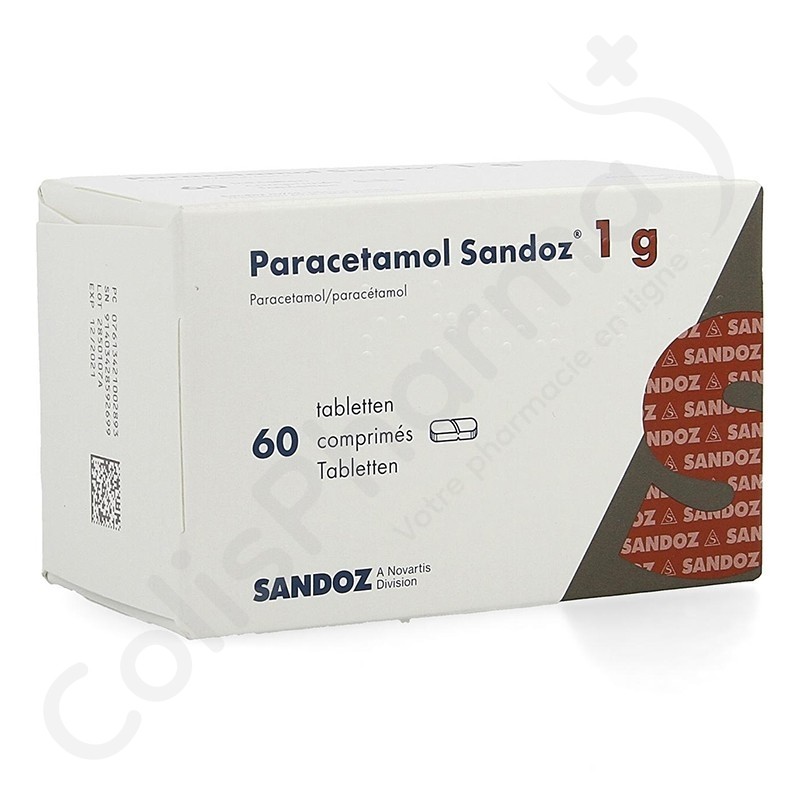 Le Paracétamol Sandoz 1g, vendu en Belgique, est un antidouleur et antipyrétique dont le principe actif est le paracétamol. Il équivaut donc au Doliprane, vendu en France, dont le principe actif est également le paracétamol. Le Doliprane, nom commercial français du paracétamol, peut être retrouvé sur ColisPharma sous le nom suivant : Paracétamol.