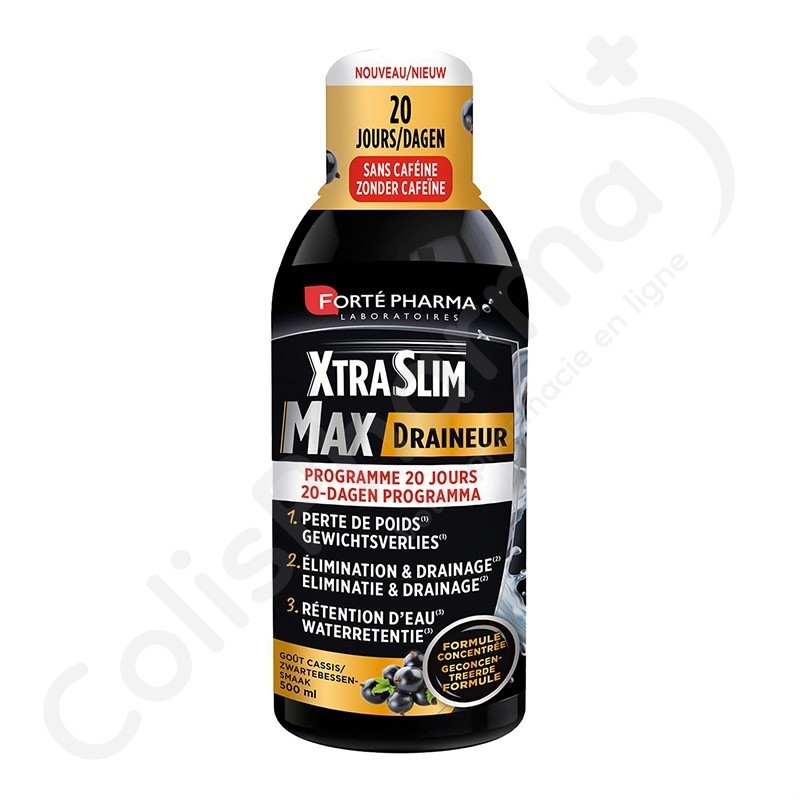 XtraSlim Draineur Max, le draineur ultra concentré pour brûler les graisses et boosté en actifs drainants. Flacon de 500 ml, soit 20 jours de cure.