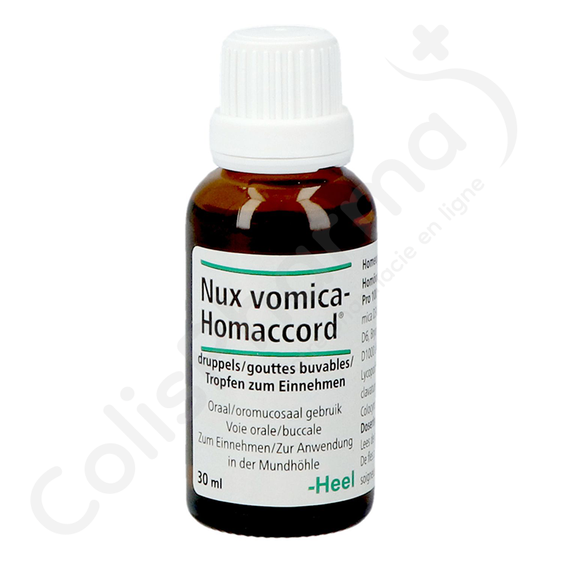 Nux Vomica-Homaccord est un médicament homéopathique contenant des composants traditionnellement utilisés dans le traitement des troubles fonctionnels du foie et de l'appareil digestif, y compris la gastrite aiguë et chronique, les brûlures d'estomac, l'indigestion, les nausées, la constipation, les ballonnements et la diarrhée; la détoxication du foie et du système gastro-intestinal, comme par exemple après l'excès d'alcool, de café ou de nicotine.