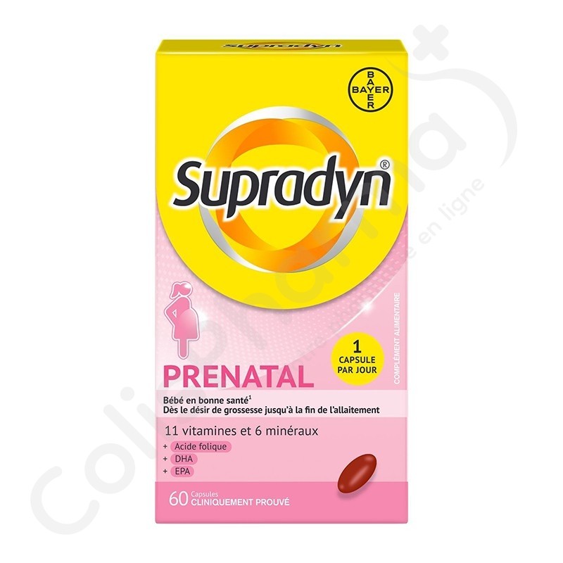 Une capsule Supradyn Prenatal contient 400µg d'acide folique. La supplémentation en acide folique augmente le statut maternel en acide folique. Un faible statut maternel en folate augmente le risque d'anomalies du tube neural, ou spina bifida, chez le foetus en développement.