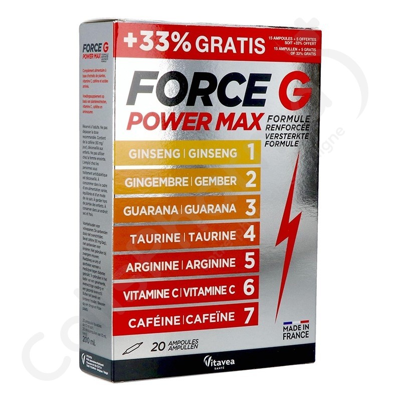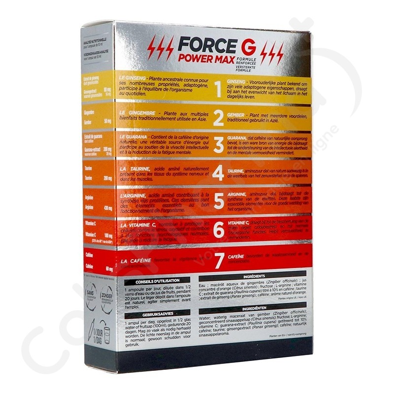 Force G Power Max associe pour la première fois 7 actifs pour offrir une réponse immédiate et efficace à la fatigue passagère.