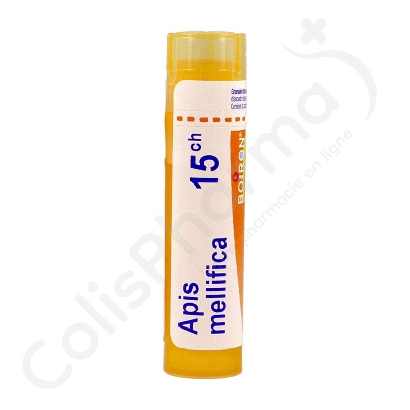Apis Mellifica 15ch est un produit homéopathique qui est indiqué pour traiter le rhumatisme avec crise aigües, les piqures d'insectes, les oedèmes apparus suite à des chocs (coups, chutes, ect), herpès, lucites, urticaires, érythèmes solaires, Cystites, Maux liés à la sphère ORL (rhinites, pharyngites, angines, otites.) et en ophtalmologie (conjonctivites, kystes et orgelets).
