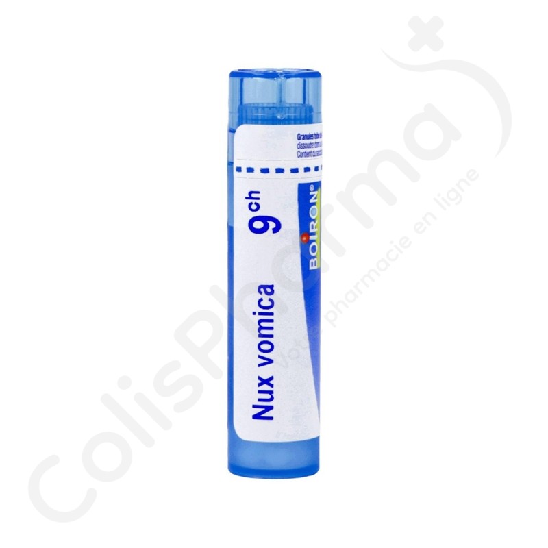 Nux Vomica 9ch est un médicament homéopathique souvent utilisé en cas de coliques chez les nourrissons, en cas de rhume survenant après un refroidissement ou de rhinites allergiques, en cas de crises hémorroïdaires avec démangeaisons et pour prévenir des effets provoqués par une consommation excessive et occasionnelle d'aliments ou d'alcool.