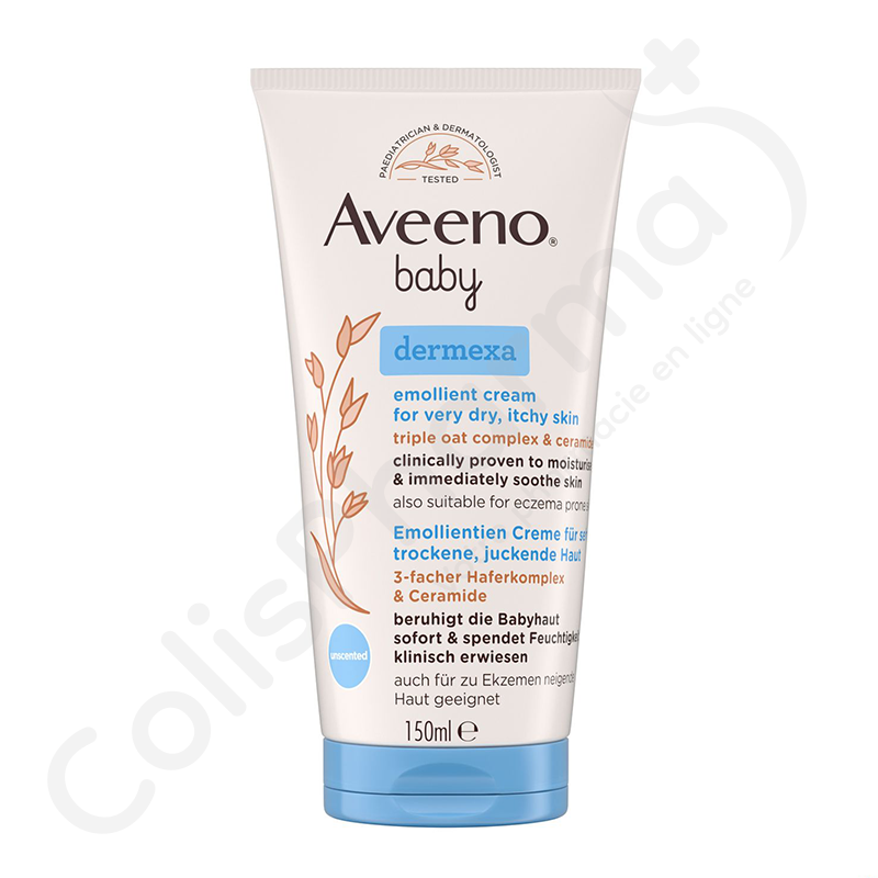 La Crème émolliente Aveeno® Baby Dermexa est spécialement formulée pour la peau de bébé très sèche, sujette aux démangeaisons et à tendance atopique. Sa formule riche et rapidement absorbée, à base d’un complexe triple avoine (extrait d’avoine, huile d’avoine et farine d’avoine colloïdale) et de céramides, est cliniquement prouvée pour apaiser et hydrater immédiatement la peau.