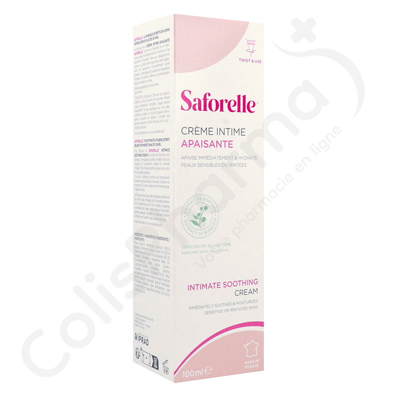 Saforelle Crème Apaisante enrichie en Bardane et en Allantoïne, calme et soulage immédiatement les irritations et les sensations d'inconfort liées aux désagréments intimes. Cette crème apaise également les sensations d'échauffement après épilation.