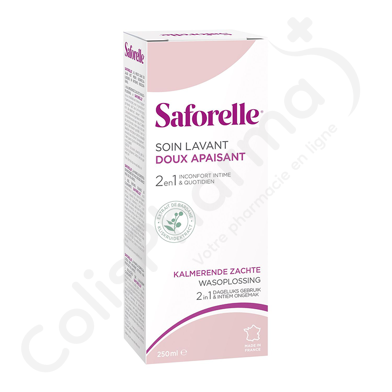 Saforelle Soin lavant est un gel intime qui protège et apaise la peau. Ce gel lavant a un pH adapté, une formulation enrichie en Bardane et en agent surgras. Cela rend ce nettoyant intime adapté à un usage quotidien ou efficace en cas d'irritations.