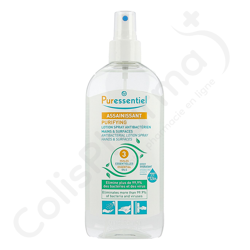 Triple action : antibactérienne, antivirale et adoucissante. 99,9% des virus et bactéries sont détruits dès les 1ères minutes. De plus, Puressentiel Assainissant - Lotion spray antibactérienne hydroalcoolique possède un effet hydratant immédiat permettant un gain d'hydratation jusqu'à 124%.