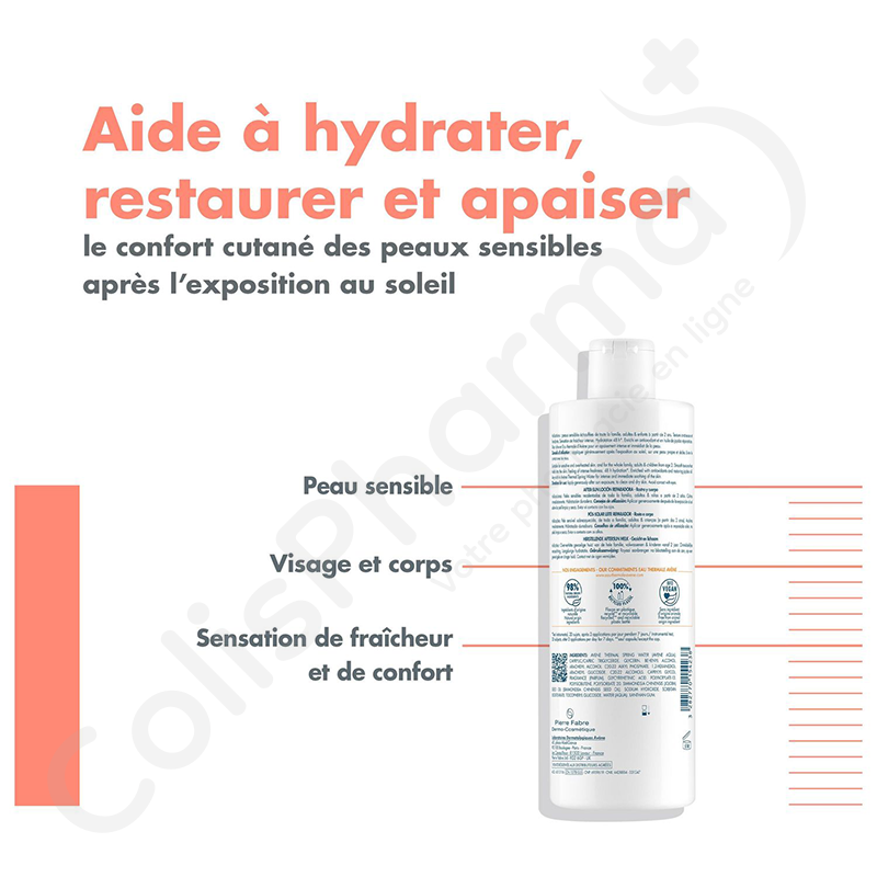 Riche en Eau Thermale d'Avène et enrichi en antioxydants et en huile de jojoba réparatrice, le Lait après-soleil apaise instantanément les peaux sensibles échauffées après une exposition au soleil. Sa texture onctueuse et fondante procure une agréable sensation de fraîcheur intense. Il apporte au visage et au corps une hydratation durable allant jusqu'à 48h* et un délicat parfum. Il convient à toute la famille, aux adultes et aux enfants à partir de 2 ans. Son flacon éco-conçu est composé à 100% de plastique recyclé et recyclable, pour un meilleur respect de l'environnement.