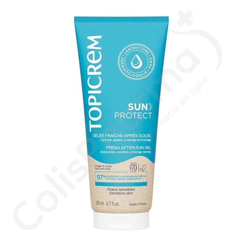 Enrichie en extrait d’Aloe Vera et Beurre de Karité, SUN PROTECT Gelée Fraîche Après-Soleil apaise et réhydrate les peaux sensibles exposées de toute la famille. Notre gelée apaise instantanément la peau échauffée par le soleil pour un effet «coupe-feu». Elle réhydrate pendant 48h*, nourrit la peau asséchée par les expositions et calme les sensations de tiraillements. Son extrait d’Echinacée prévient le photo-vieillissement et rend la gelée antioxydante.