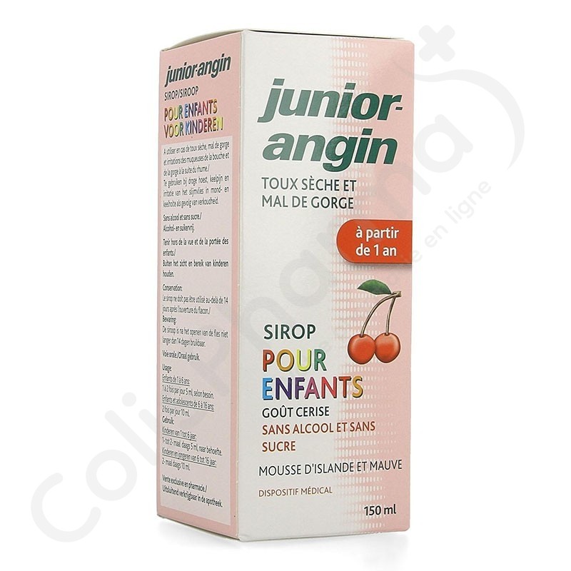 Junior Angin est un sirop goût cerise à utiliser en cas de toux sèche, de mal de gorge et d'irritations des muqueuses de la bouche et de la gorge à la suite de rhumes.