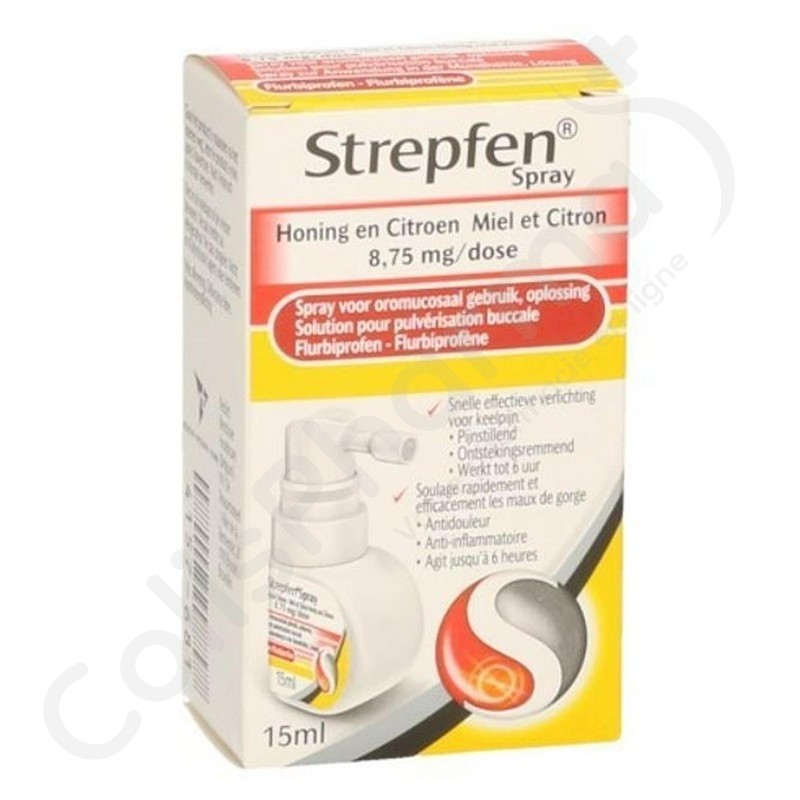 La substance active est le flurbiprofène. Le flurbiprofène fait partie d’un groupe de médicaments appelés anti-inflammatoires non stéroïdiens (AINS), qui exercent leur effet en modifiant la manière dont l’organisme répond à la douleur, à l’œdème (gonflement) et à la fièvre. Strepfen Spray Miel et Citron est utilisé pour soulager à court terme les symptômes de maux de gorge tels qu’un endolorissement, des douleurs, une difficulté à avaler et un gonflement au niveau de la gorge.