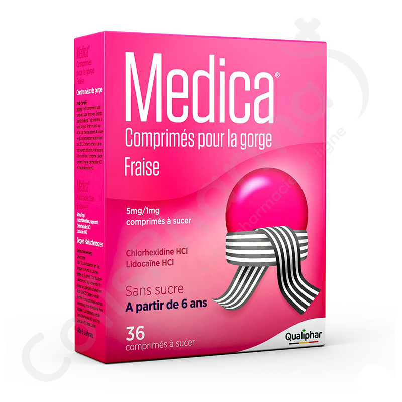 Medica comprimés pour la gorge fraise est un comprimé à sucer pour une action locale dans la bouche et la gorge. Il est un désinfectant et analgésique local. Il est indiqué dans :