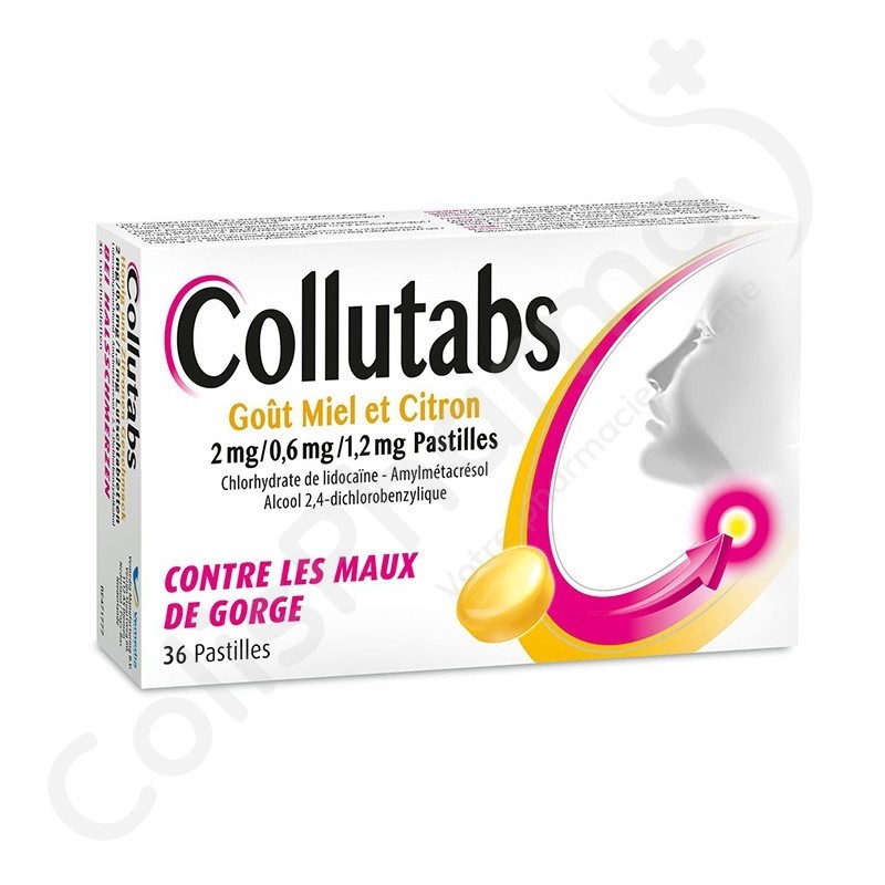 Collutabs Miel Citron 2mg / 0,6mg / 1,2mg est un médicament contre les douleurs et les infections de la gorge (antiseptique et anesthésique). Collutabs contient de l'amylmétacrésol et de l'alcool 2,4-dichlorobenzylique (antiseptique) et du chlorhydrate de lidocaïne (anesthésique local pour la gorge).