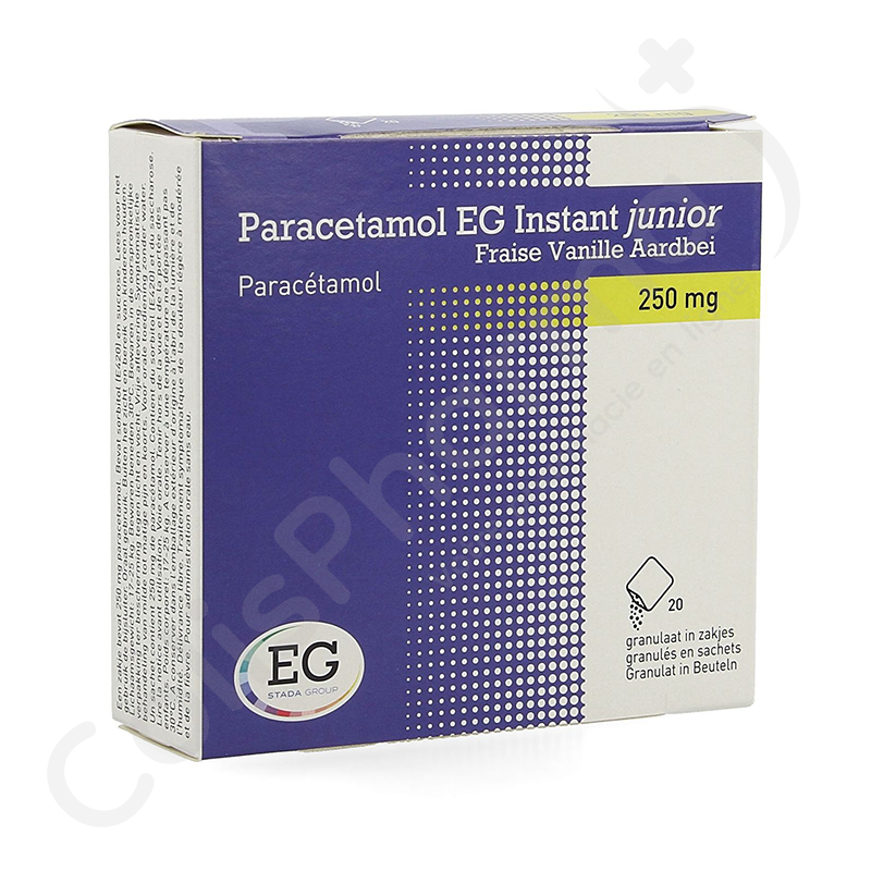Le Paracétamol EG Instant Junior 250 mg, vendu en Belgique, est un antidouleur et antipyrétique dont le principe actif est le paracétamol. Il équivaut donc au Doliprane, vendu en France, dont le principe actif est également le paracétamol. Le Doliprane, nom commercial français du paracétamol, peut être retrouvé sur ColisPharma sous le nom suivant : Paracétamol.