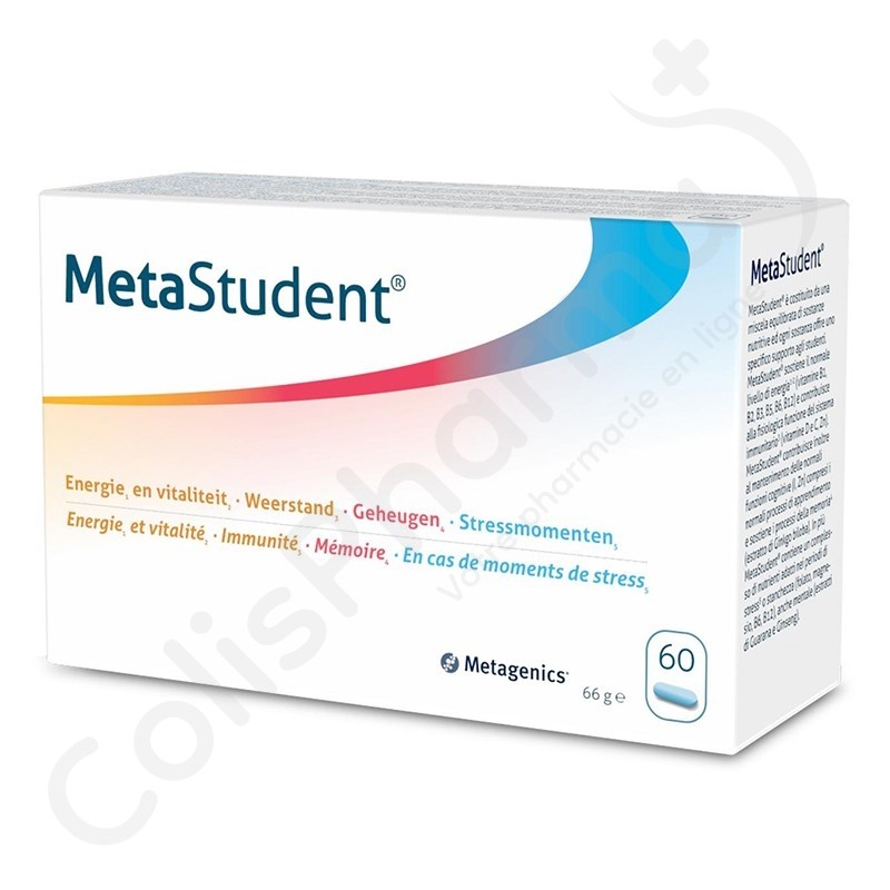 MetaStudent contient en outre des nutriments utiles en cas de moments de stress (folate) et de fatigue (folate, magnésium, vit. B6, B12, extrait de guarana).