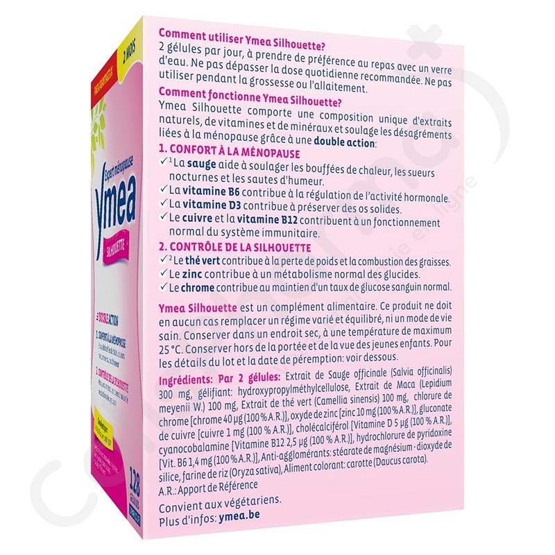 Ymea Silhouette contient un mélange unique d'extraits naturels, de vitamines et de minéraux. La formule est exempte d'œstrogènes. Sans soja, sucre ajouté, conservateur, gluten, lactose.