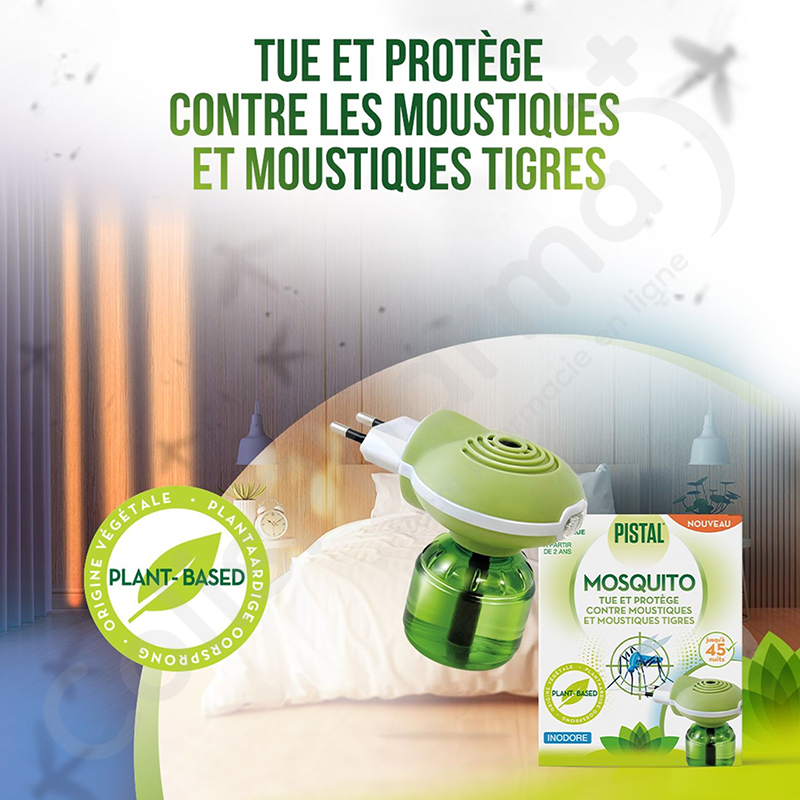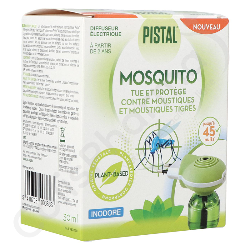 Le diffuseur électrique Pistal Mosquito diffuse des pyréthrines dans l'air, un ingrédient d'origine végétale. Cette substance tue les moustiques et les moustiques tigres et/ou les empêched'entrer dans la pièce où le diffuseur anti-moustique est branché.