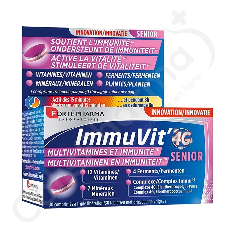 Notre système immunitaire nous protège des éléments extérieurs néfastes, mais celui-ci peut s'affaiblir dû à la fatigue, à la pollution, au stress mais aussi la vieillesse. Immuvit' 4G Senior soutient notre immunité naturelle et active votre vitalité grâce à sa formule complète et technique composée de vitamines, minéraux, ferments et plantes. La formule est spécialement prévue pour les seniors avec un renforcement en ginseng, myrtille, lutéine, éleuthérocoque, vitamine D et zinc. En plus de l'immunité, Immuvit' 4G Sénior soutient également la vue, les os, et stimule votre vitalité physique et intellectuelle.