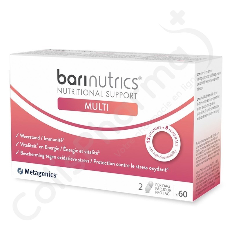 Lorsque vous réduisez votre estomac après un régime ou une opération, les vitamines et les minéraux peuvent être également moins bien absorbés par votre corps. Une carence générale en vitamines et minéraux peut se produire. BariNutrics Multi est un mélange unique de vitamines sous des formes actives et minéraux bien absorbés par l'organisme.