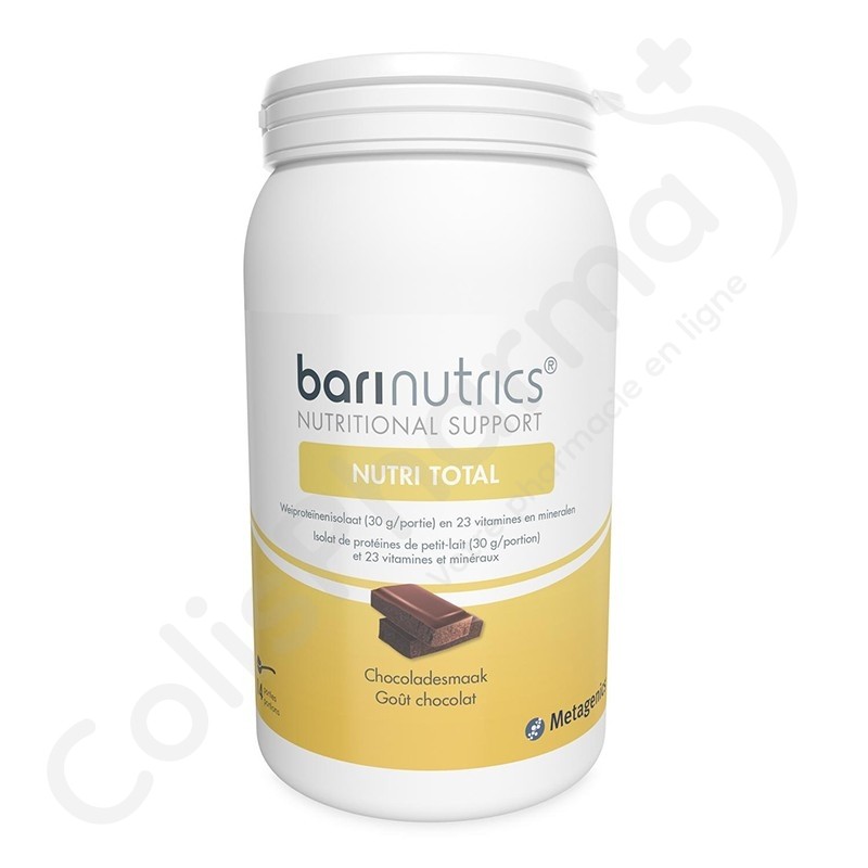 BariNutrics Nutri Total est une poudre hypocalorique contant un isolat de protéines de petit-lait, avec 23 vitamines et minéraux essentiels ajoutés. BariNutrics NutriTotal contient les vitamines B1, B2, B3, B5, B5 en B12, qui soutiennent les taux d'énergie. Les vitamines B6 et B12 contribuent avec le folate aussi à une diminution de la fatigue. BariNutrics Multi contient aussi les vitamines C, D, du zinc et du sélénium, qui soutiennent une fonction normale du système immunitaire et de la vitamine E, qui aide, avec le sélénium et le zinc, à protéger les cellules contre le stress oxydant.